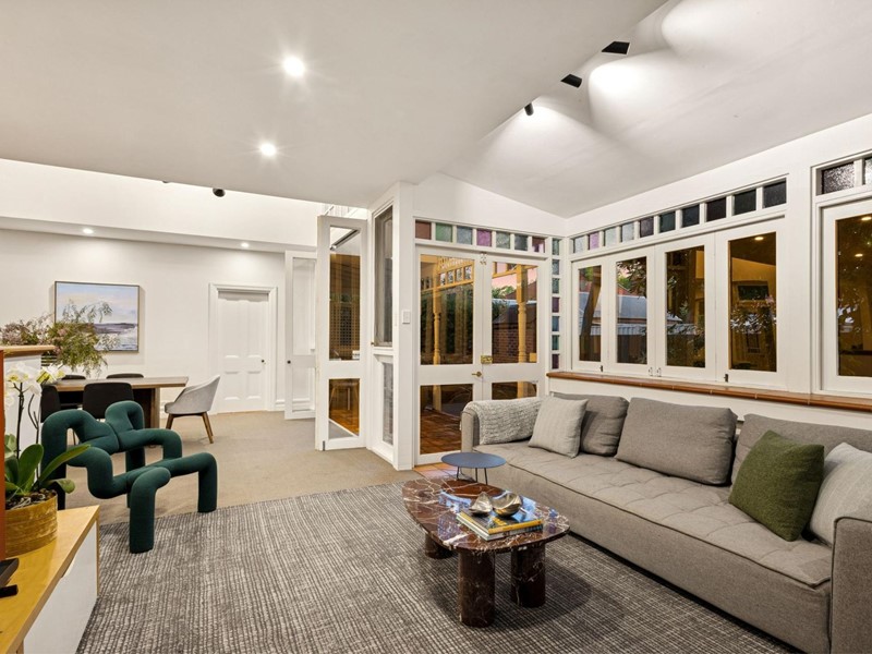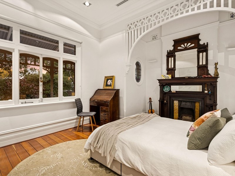 Entry into the home is through beautiful timber fretwork, echoed in the intricate brickwork behind. The stunning stained glass surrounds lead into a spacious entry hall, with wide polished boards and soaring ceilings. Beautiful character features abound throughout, including decorative fireplaces and intricate ceiling roses.