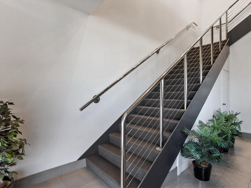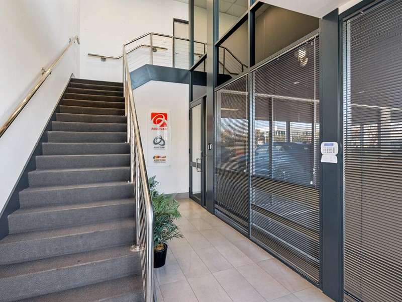Tiled foyer entry with stairs leading to open plan office area, with small recess for storage/filing/server room, own kitchen & bathroom, located on the 1st floor.