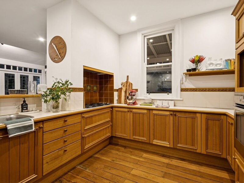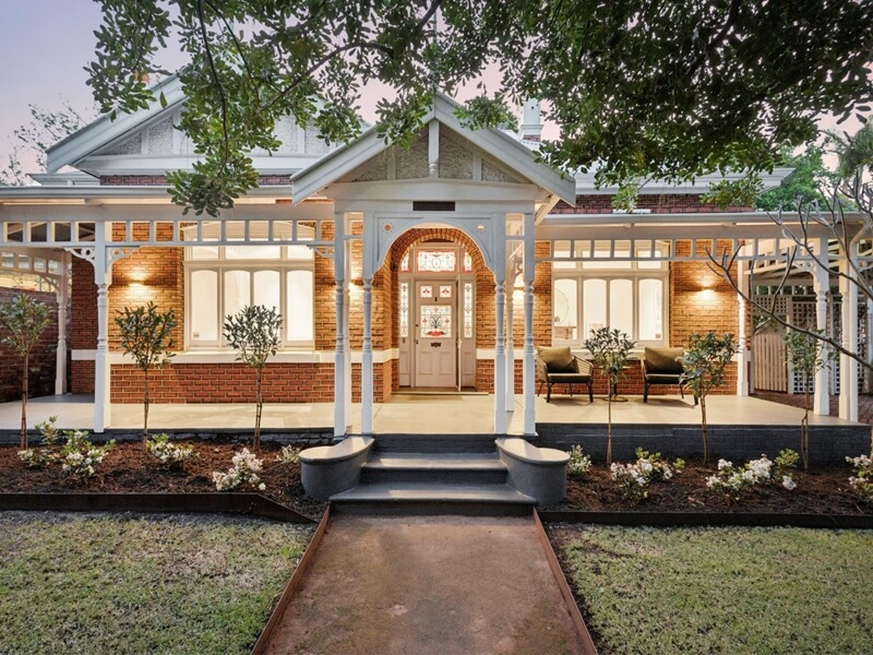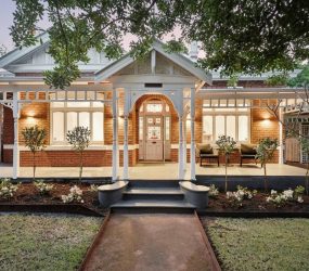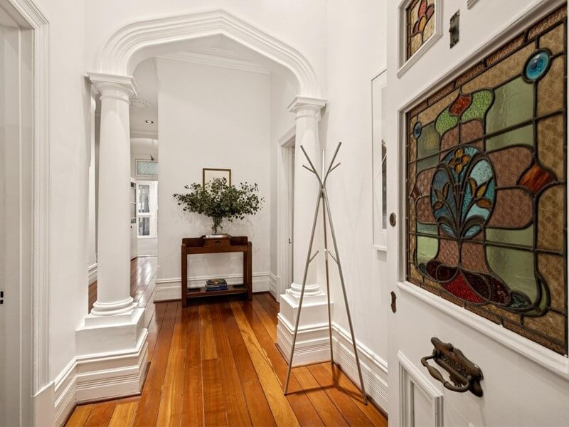 Entry into the home is through beautiful timber fretwork, echoed in the intricate brickwork behind. The stunning stained glass surrounds lead into a spacious entry hall, with wide polished boards and soaring ceilings. Beautiful character features abound throughout, including decorative fireplaces and intricate ceiling roses.